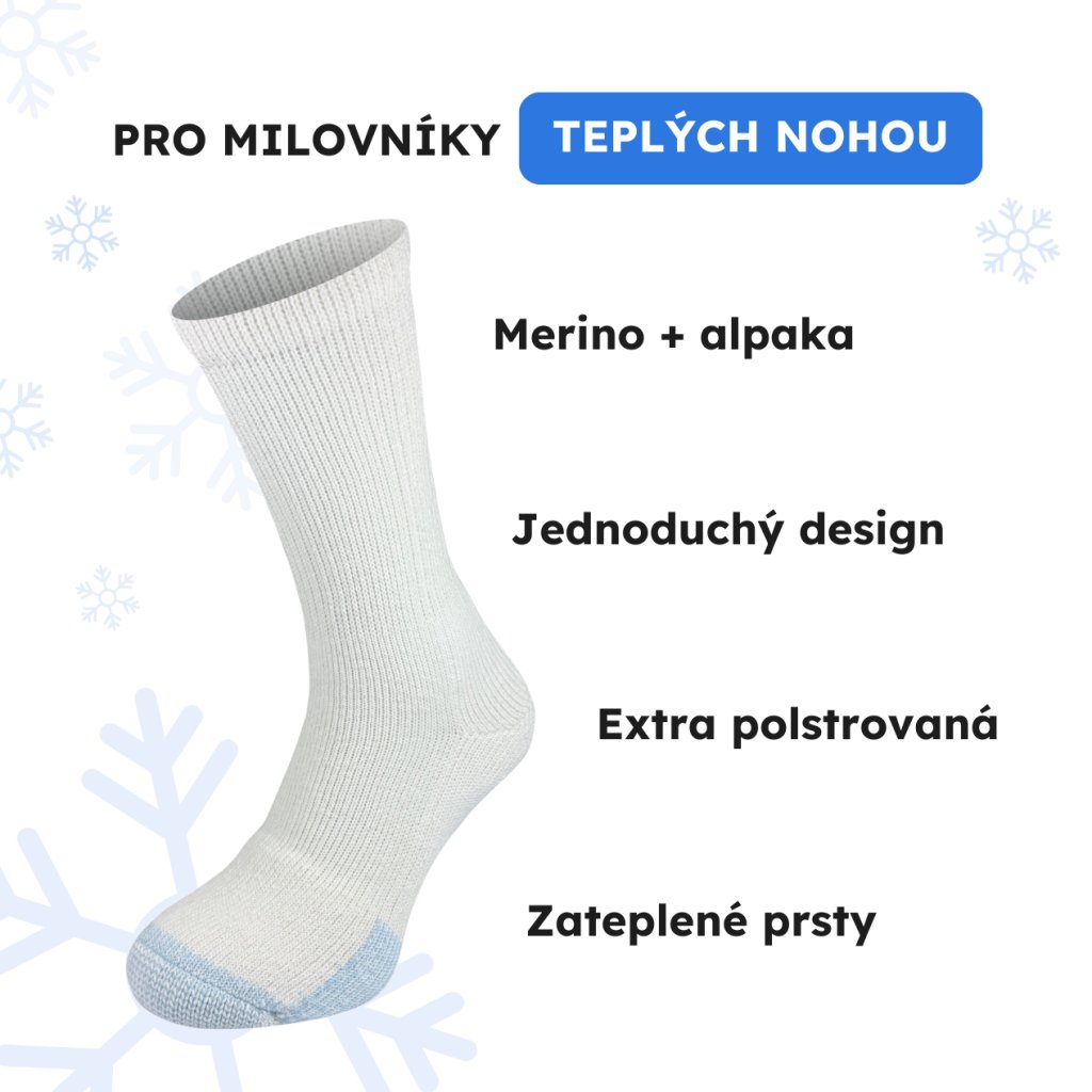 Čistý bílý design s jemným detailem na špičce. Žádné zbytečnosti, jen to podstatné – teplo, pohodlí a spolehlivost. Kombinace merino a alpaka vlny s vylepšeným zateplením dělá z této ponožky parťáka do každé extrémní zimy.
