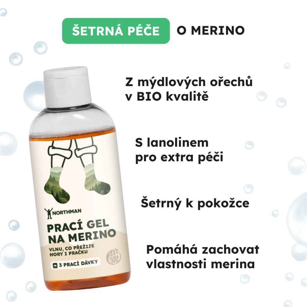 Tenhle gel je sice malý, ale pro merino udělá velkou službu. Je vhodný na vlněné i funkční oblečení z merino vlny a navíc je šetrný k vláknům i citlivé pokožce. A právě proto je ideální jako dárek k našim merino ponožkám. Protože se správnou péčí vám budou dělat radost ještě o něco déle.